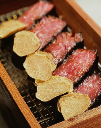 肉そのものについても、牛の品種から肉の等級、そしてステーキの厚みまで、あらゆる選択肢を綿密に試し、管理してきました。現在、HakuSteakの絶品和牛は、1946年から黒毛和牛を飼育する、古風で趣のある白老町の4世代続く農家から仕入れています。この農場の牛は商業目的で飼育されているわけではなく、愛情をこめて育成され、天然有機飼料を食べて育ちます。HakuSteakは専属契約を結ぶことにより、この非常に珍しい和牛を安定的に確保できる唯一のレストランとなりました。これにより、一口ごとに、神秘的な第5の味覚である「うま味」が口の中で溶け出す、肉全体に滑らかな網状のサシが入った霜降りの分厚い脂の乗ったA4ランク和牛を提供できるようになりました。